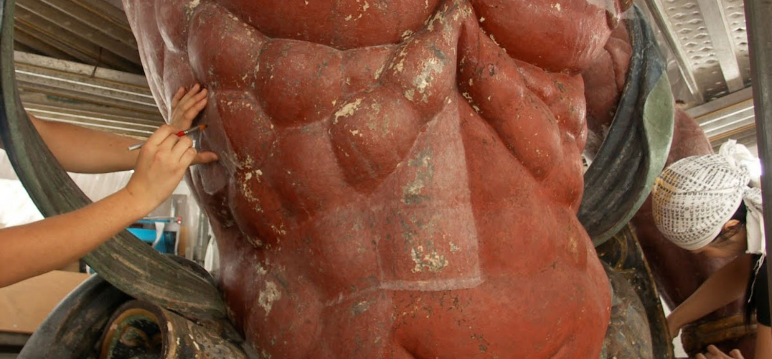 In the restoration of wooden statues, the first step is attending to scratches and stains, and the second is prevention of fading and cracking. Here tengu is applied to the surface, and if necessary, extra color is added on top of this layer. In order to perfectly fit with the curves of a statues surface, thin, strong, transparent tengu is ideal. The gentle expression of wooden sculptures can be preserved with tengu because the fibers of kozo (Japanese paper mulberry, the raw material that makes up tengu) are long, porous, and flexible, allowing it to adhere well to these surfaces.
